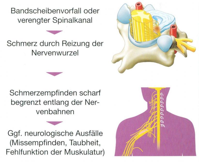 Same applies for abnormalities in the bladder function or walking disorders. Due to pressure on the spinal cord permanent damage could appear. This clinical picture is called Myelopathy.
