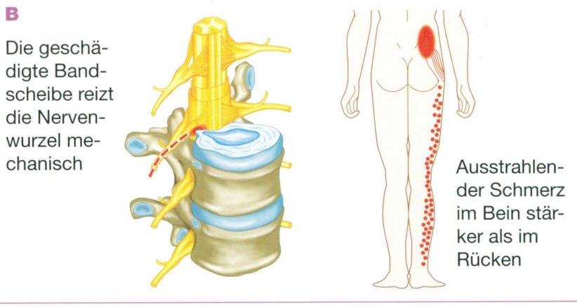If the pain radiates into the leg it is very likely that a slipped disk depresses the nerval root. There is the possibility that nerval damage increases which could lead to paralysis. Please try to stand on your toes while standing on one foot. Other ways to check for a lumboischialgia is to walk on the heels or to check the ability to climb stairs.