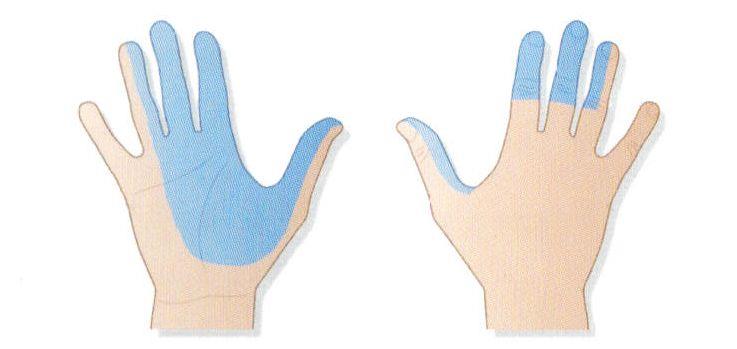 Character: dragging or prickling. Can be triggered by biking or deviating the hand. In an advanced stage the spreading of the fingers can be limited.