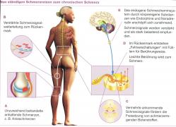 A chronic pain can be seen as a pain which lasts for a longer period of time (around 3- 12 month). Longer lasting pain can develop to a pain syndrome which is an individual disease or pain syndrome. The pain has lost its original function and is characterized by its organic discomfort as well as the psychosocial changes which result out of the pain.In most of the cases a chronic pain has not a single but multiple causes.