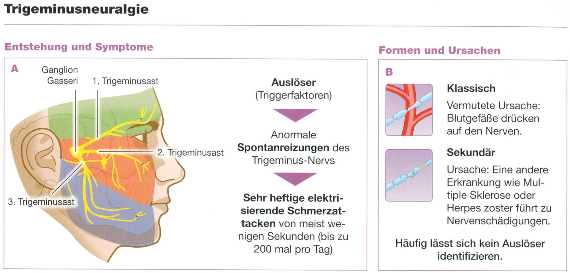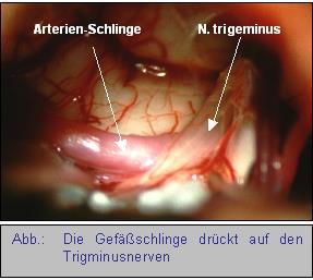 In most of the cases a trigeminal neuralgia is caused by a too tight connection between the nerve and certain arteries in the region of the brain stem.