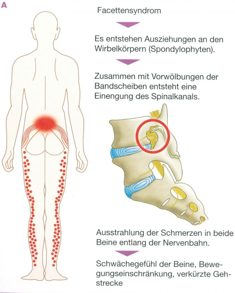 A spinal stenosis is a medical condition which developes very slowly. During the first few years it shows only mild symptoms but the discomfort can increase exponentially during time. You can easily compare this phenomenon with a biological system which when all backup possibilities are depleted. In most of the cases the pain comes up after short distances of walking and irradiates in both thighs. The walking distance until the pain appears can vary between one kilometer or only several meters. It is very common that small breaks, sitting down or bending down mitigates the pain. In some cases the spinal stenosis can cause weakness, sensation problems or even bladder disfunctions. Normally the ability to bike is not impaired which enables the physician to differentiate between a spinal stenosis and a narrowing of a vessel.
