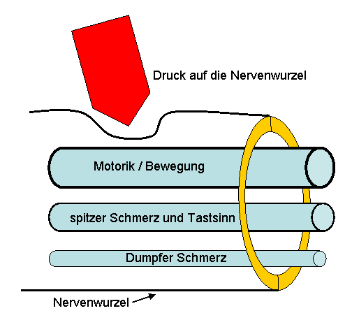 Zwischen 2 Wirbelkörpern verlässt auf jeder Seite eine Nervenwurzel den Wirbelkanal. Die einzelnen Nervenstränge werden von der harten Hirnhaut geschützt. Das Nervenbündel besteht aus einem Gemisch von Fasern, die Informationen an das Gehirn leiten (Schmerz, Stellung der Gelenke, Gefühl) und solchen, die Befehle vom Hirn an die Muskeln leiten. Je nach Aufgabe der Fasern sind diese unterschiedlich dick. Bei Druck auf eine Nervenwurzel werden zuerst die dünnen und empfindlichen Schmerzfasern aktiviert, man spricht von einer Nervenreizung. Bei weiterem Druck kann es zu einer Schädigung kommen, die zuerst einen Ausfall der Gefühlsfasern (Taubheit) und später auch eine Schädigung der robusten Bewegungsnerven (Lähmung) bedeutet. Jetzt können die Schmerzfasern "ihren Dienst" einstellen: "Die Schmerzen gehen, die Lähmung kommt".