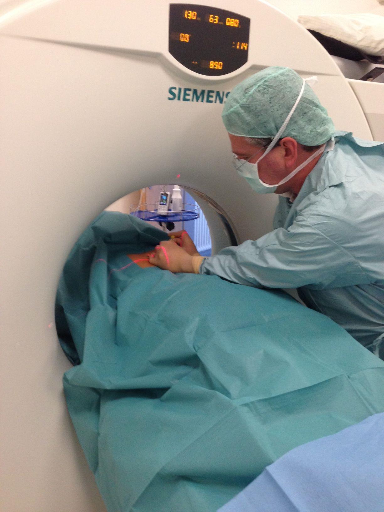 The surgeon will insert a very small needle into the painful joint and will be guided by an X-Ray control. With the help of the needle where a small laser fiber can be inserted the surgeon can now desolate the nerve which causes the pain.