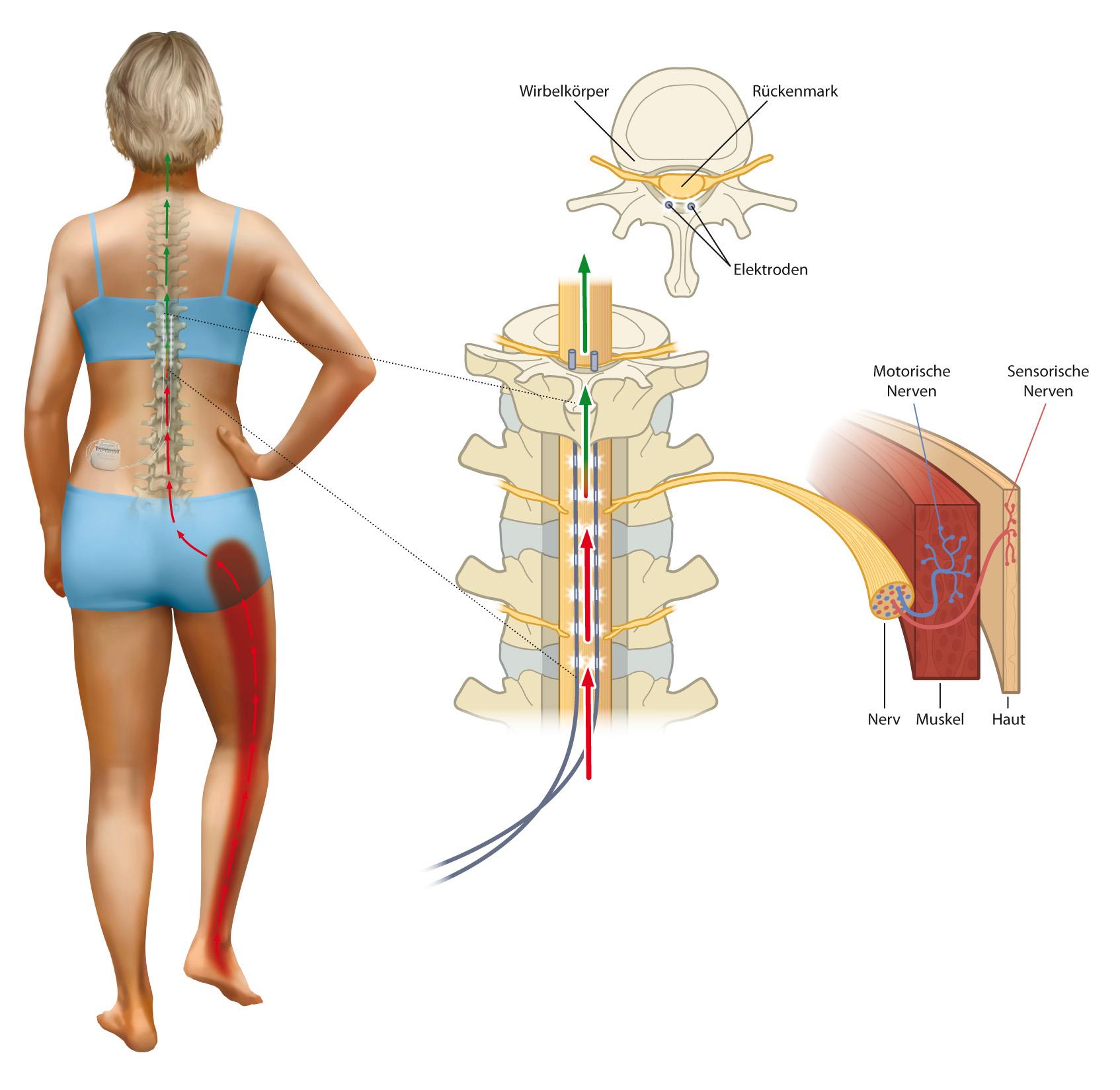 With the help of stimulatory electrodes it is possible to stimulate the peripheral nerves and the spinal cord to treat chronic nerve pain. Due to the electrodes it comes to an irritation of the nerve which deplaces the nerve pain. This effect can stay longer than the stimulatory phase.