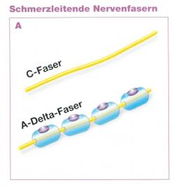 The A- fibers transmit the more important informations to the brain. The quantity of information which can be transmitted via the spinal cord to and to the central nervous system is limited which means that if the “important” A- fibers transmit information the CNS inhibits the slower C- fibers. This is the way the TENS device works, it slows down the A- fibers.