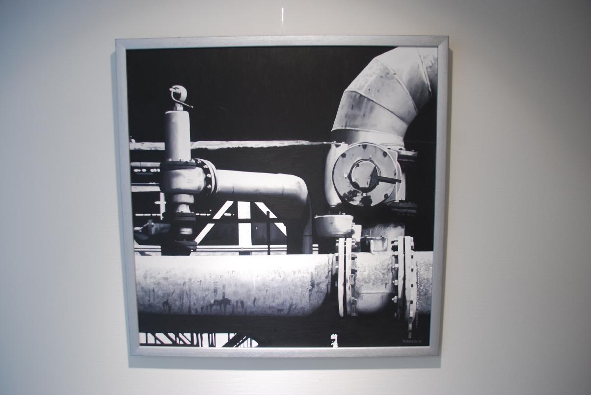 Seine fotorealistischen Ölbilder präsentieren diese Landschaften, die Kathedralen der Stahlgewinnung, die eher stillen kleinen Industriegebiete, Fragmente, wie Stillleben aus Rohren morbide verrostet. Und Menschen, die gerne an diesen Orten wohnen.